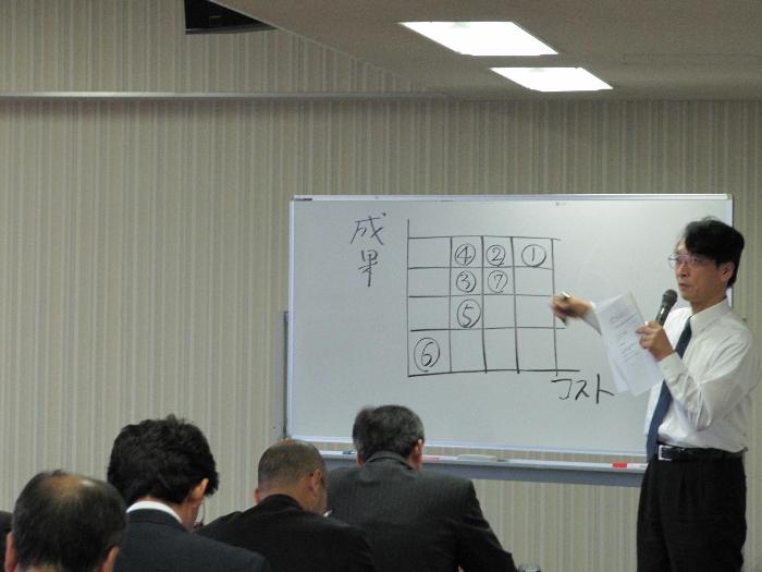 今回の研修は、その成果報告書として提出している基本事業評価シートの各項目は、どういった考え方に基づいて記述されているのか、また、成果志向の行政経営の理論について講義していただきました。