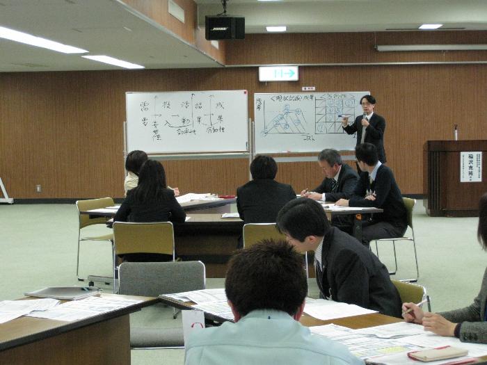 この研修では、今回新たに導入した「基本事業評価」について、「他団体と比較可能な基本事業指標の設定の仕方」、「指標の目標値を達成するための事務事業のメリハリの付け方」、「基本事業の現状分析と改善提案の手法」などの行政評価スキルの向上を図ることを目的にしています。