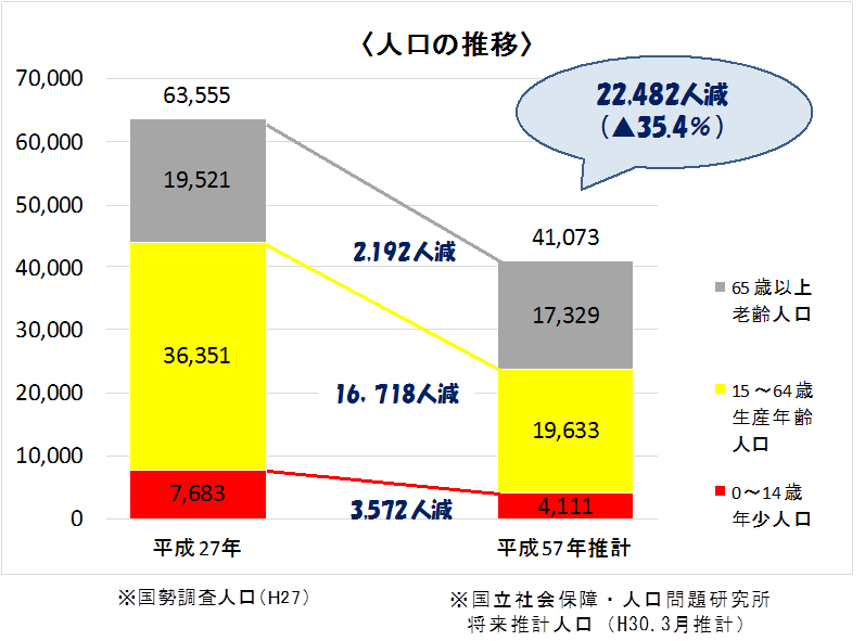 国立社会保障・人口問題研究所による「日本の地域別将来推計人口(平成30(2018)年3月推計)」によると、秩父市の人口は今後30年間で約35%(約2万2千人)も減少すると推計されています。