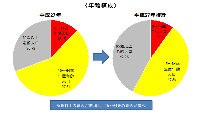特に生産活動の中心となる15歳以上65歳未満の人口及び割合が最も減少すると予想され、今後も少子高齢化が進んでいく見通しです。