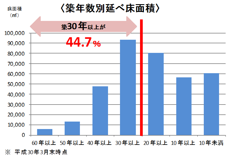 今後の更新等にかかる費用が多額になってしまう要因の一つとして、老朽化対策が必要になることがあげられます。築30年以上の施設の延べ床面積は、全体の44.7%を占めています。改修などで対策を講じなければなりませんが、時期が集中しやすい状況にあります。