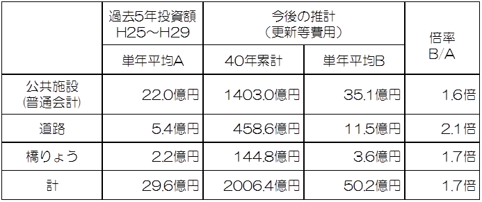 平成24年3月に総務省が公表した「公共施設及びインフラ資産の将来の更新費用の比較分析に関する調査」による全国平均(調査回答111団体)を大幅に上回っています(平均値(加重)の1.45倍、中央値の1.29倍)。