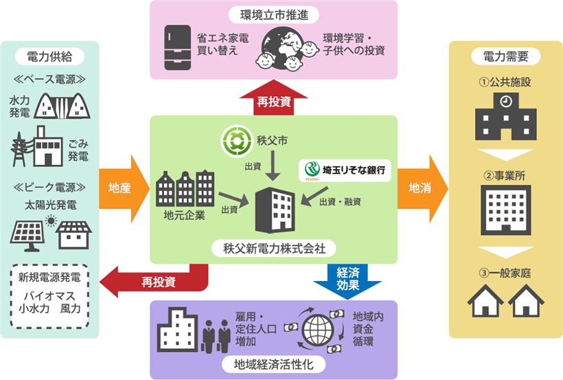 電気使用料金として秩父市から流出していたお金を、できる限り地域にとどめ、地域内で循環させることにより、地域経済の活性化を図ります。