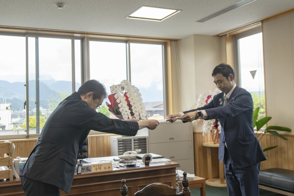 副市長に引間淳夫さんが選任され、辞令を交付しました。引間さんは、これまで秩父市役所で多様な役職を経験し、行政について深い理解を持つ頼もしい方です。副市長の選任について多くのご質問をいただきましたが、最終的には議員の皆さまの全会一致で承認をいただきました。