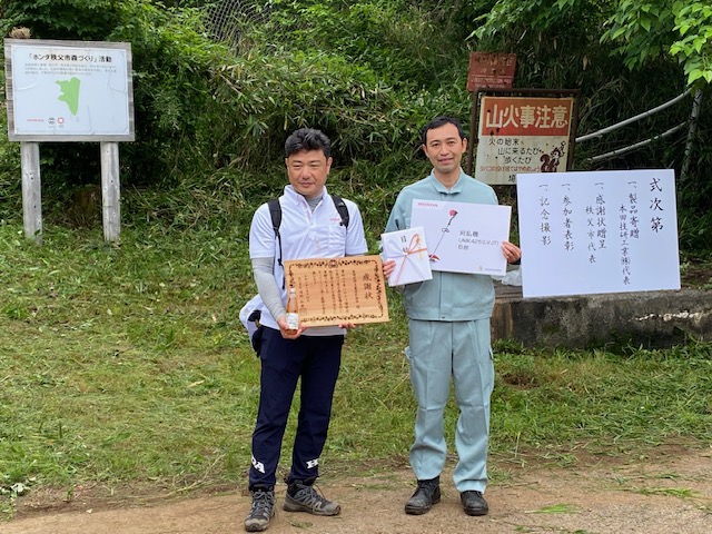 6月14日(土)には、埼玉県と本田技研工業株式会社との森林づくり協定の終了セレモニーに出席しました。本田技研工業様には、平成28年から10年間にわたり、秩父市の定峰の市有林で活動をしていただきました。当初は荒れた土地が多かったそうですが、皆さんの手によって植えられた木々が立派に成長し、森へと生まれ変わりました。